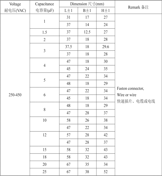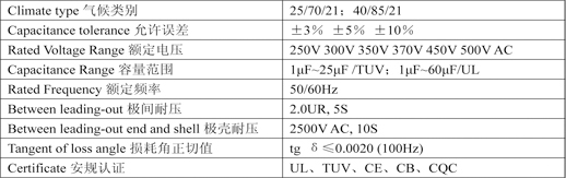 該產(chǎn)品采用金屬化薄膜卷繞,外殼采用ABS或耐高溫阻燃PBT材料,阻燃環(huán)氧樹脂封裝,電極引出方式采用有安規(guī)的電線或187#、250#單插片、雙插片。
